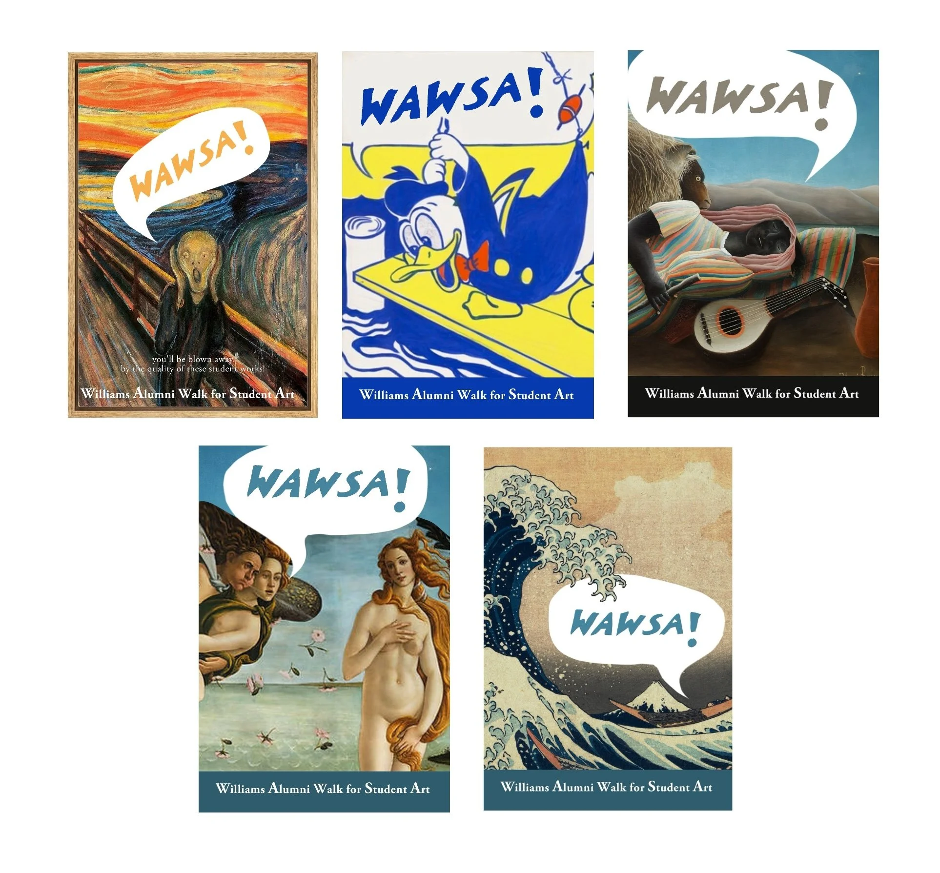 For the WAWSA poster series, we used the levity of the event acronym and eye catching masterworks to attract the attention of students and alumni on the Williams campus during alumni weekend.